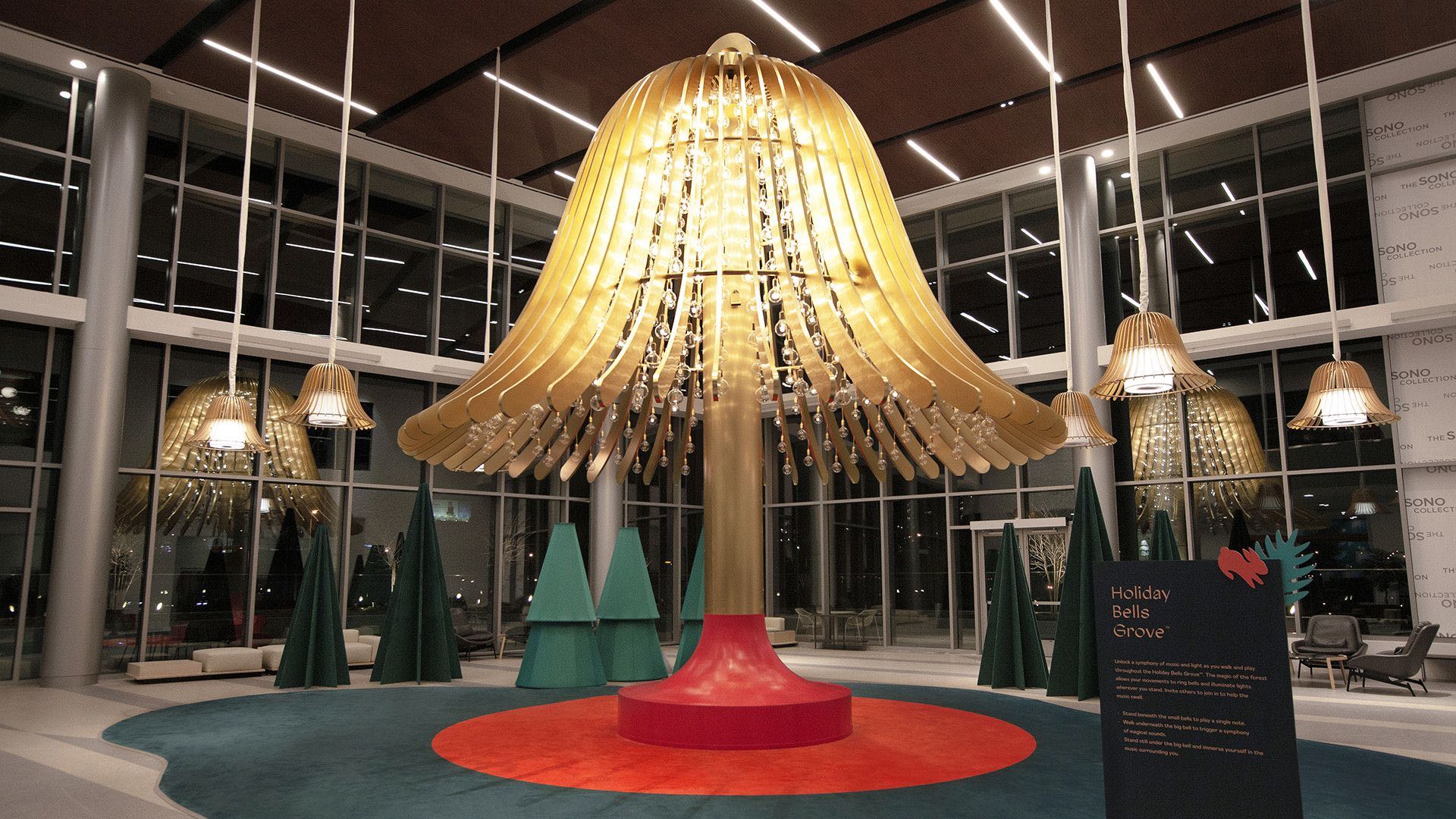 The Wishing Forest is a series of installations that are playful twists of classic holiday trees. Whether it’s a tree that is lit up with 25,000 individually addressable LEDs that react to an ornament flying through pneumatic tubes, or a 30 foot bell that creates a symphony of chimes triggered by body movement - these are holiday displays that visitor can interact and create with. Brookfield invites their holiday guests to try forest groves inspired by the mechanical magic of classic coin op arcades and music boxes; to make their own memories in crafted sets; and to create their own forest scape with trees that analyze the rhythmic properties of their voice.