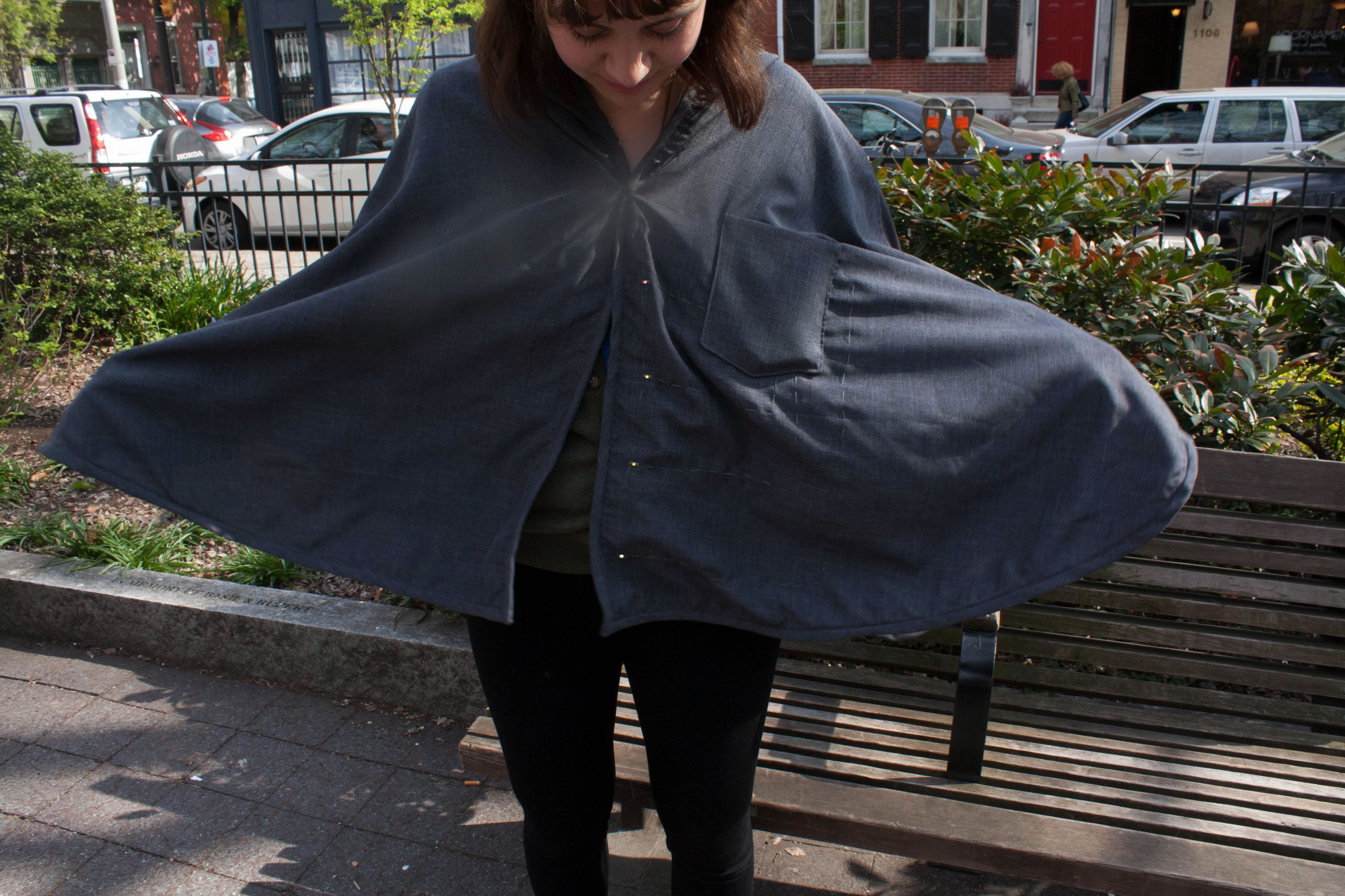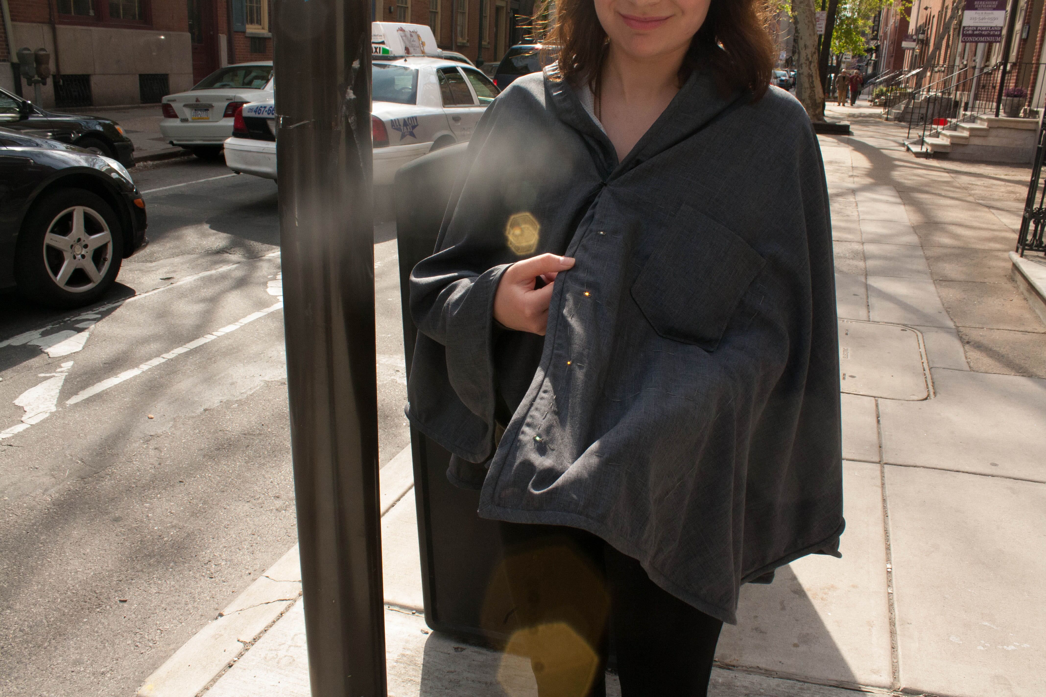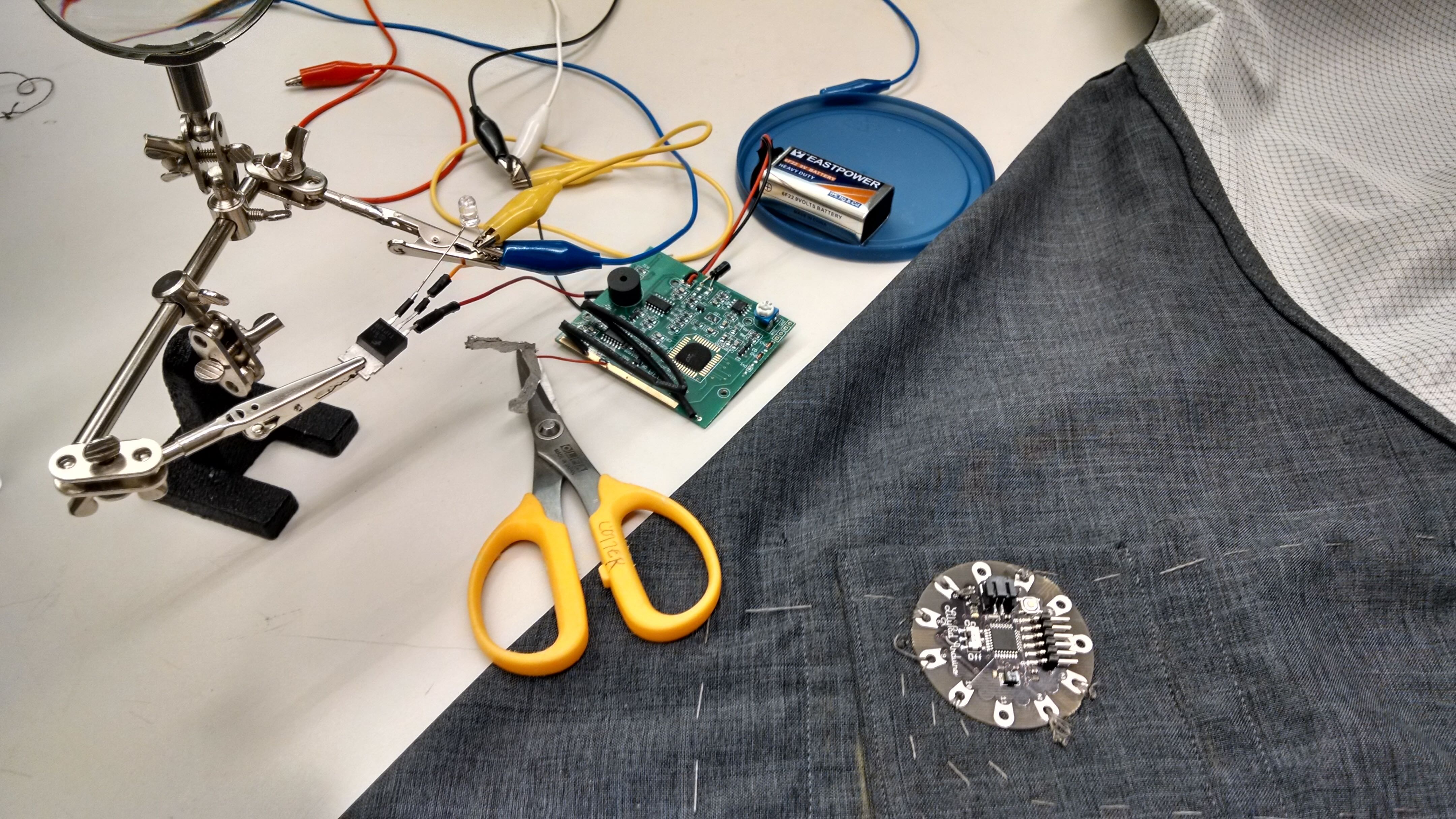 In my senior fall semester, I made a prototype wearable that used a jumper wire as a sensor. The prototype itself only proved to be a capacitive sensor, but it helped me get used to using the Lilypad microcontroller as the conduit of my design. In the spring, I reverse-engineered an existing EMF sensor to have a qualitative output and mapped that output onto a coat.